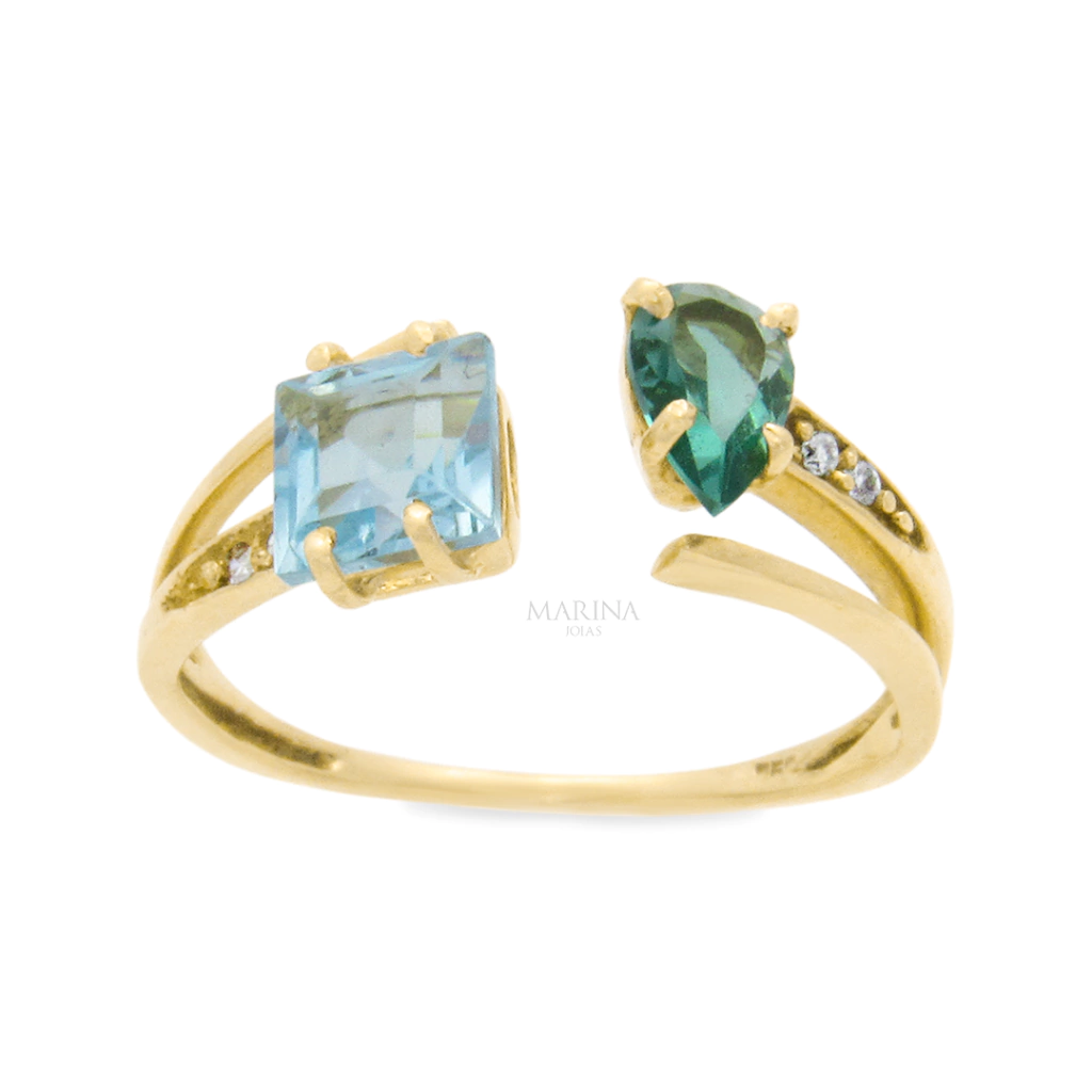 O Anel em Ouro 18k de Aro Ajustável com Pedras de Topázio Carre Azul e Turmalina Gota Verde é uma peça de joalheria encantadora e única, combinando a beleza do ouro com as cores vibrantes do topázio azul e da turmalina verde.