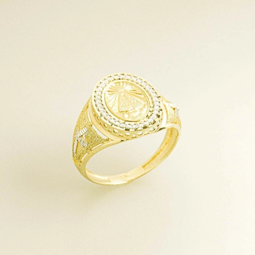 A joia apresenta a medalha de Nossa Senhora Aparecida em relevo, com um trabalho no laser diamantado que proporciona detalhes delicados e precisos à imagem.