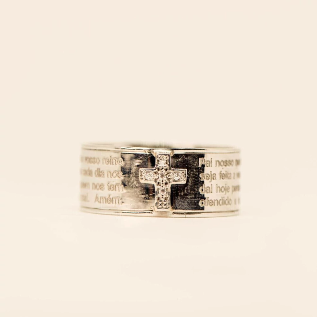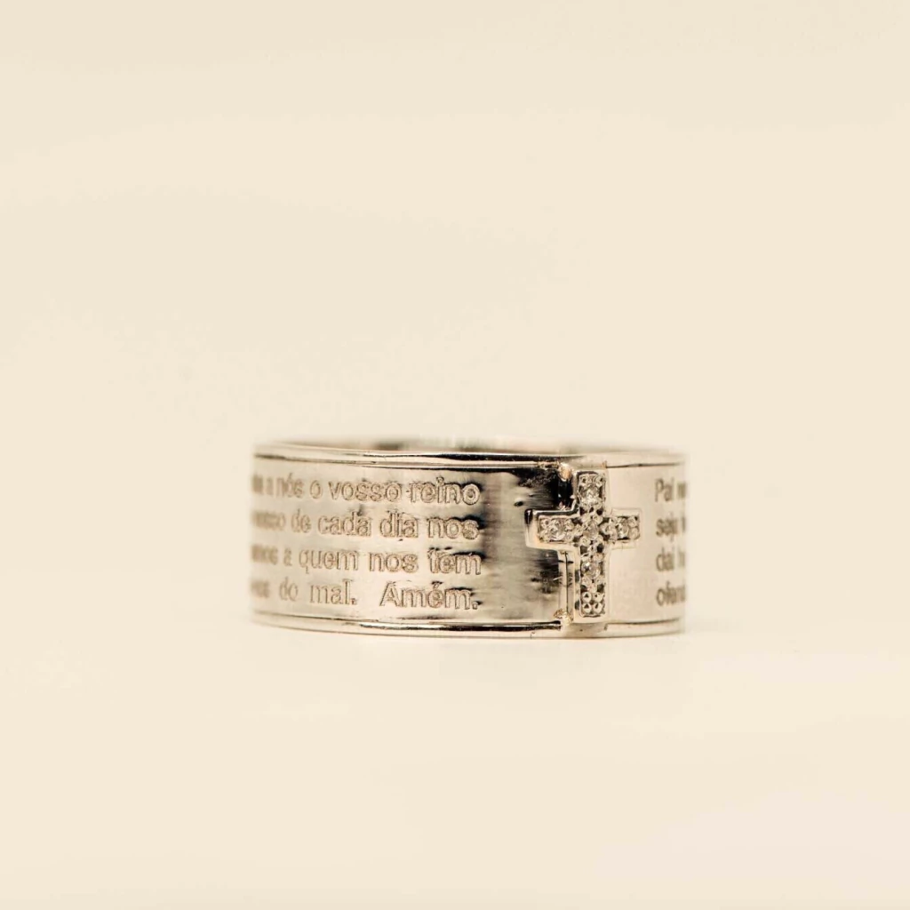 Um anel ?Pai Nosso? em ouro branco 18k com pedras de zircônia é uma bela joia religiosa com um significado especial. Esse tipo de anel costuma apresentar a oração do ?Pai Nosso? em seu design, gravada ou inscrita ao redor do aro do anel, criando uma peça significativa para quem tem fé.