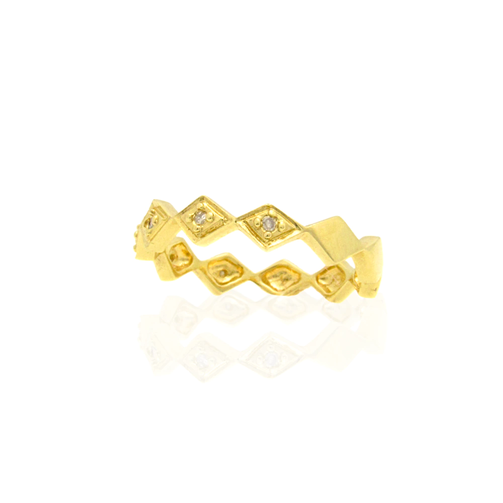 O Anel Trama Diamantada com Zircônias em Ouro 18K é uma joia sofisticada que une a delicadeza do design em losangos com o brilho intenso das zircônias. Uma peça moderna e refinada, perfeita para quem deseja valorizar seu estilo com exclusividade.