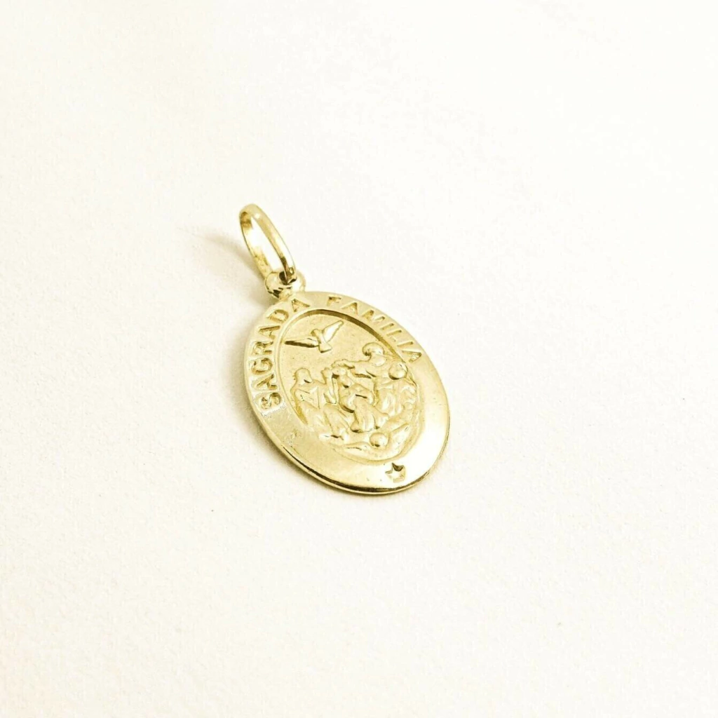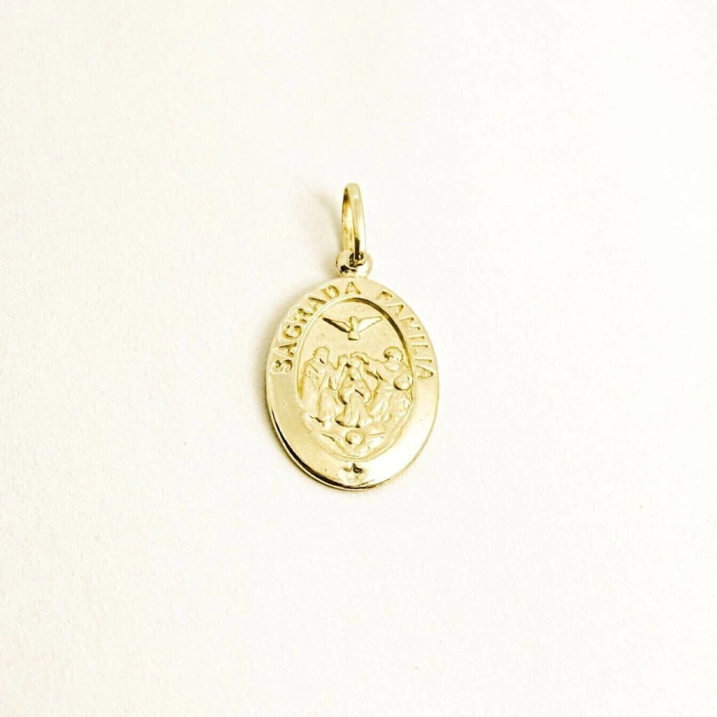 A ?Medalha da Sagrada Família em Ouro 18k? é uma peça de joalheria que representa a união sagrada entre Jesus, Maria e José, simbolizando a família cristã e a devoção religiosa.