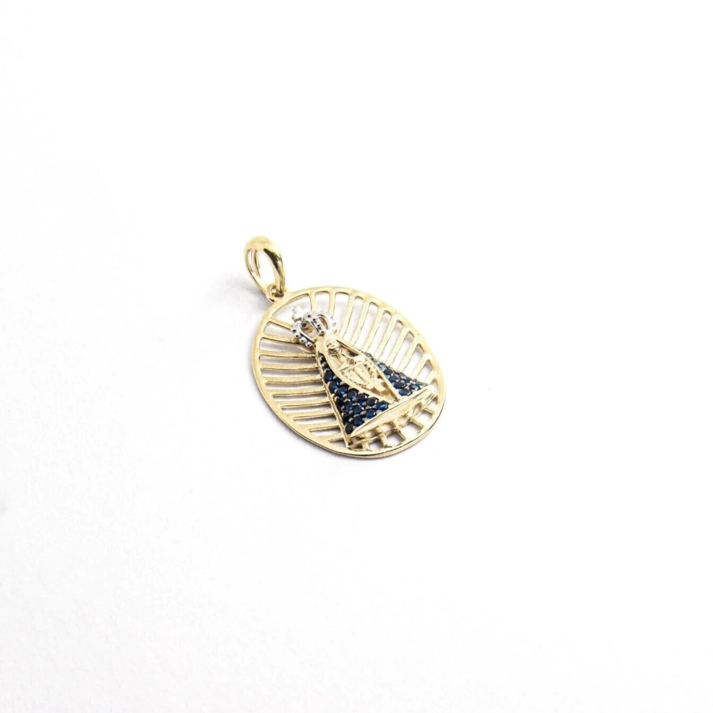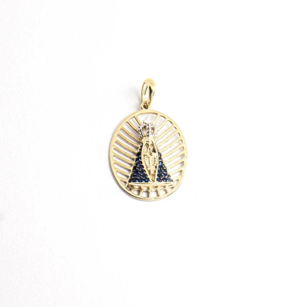 Apresenta um design meticulosamente esculpido de Nossa Senhora Aparecida, com zircônios azuis cravejadas nas suas vestes, proporcionando ainda mais brilho e trabalho no ródio branco na sua coroa, garantindo sofisticação à joia.